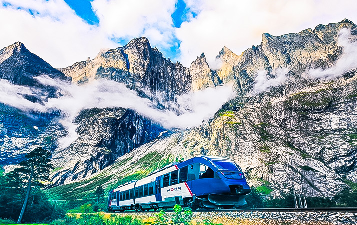 挪威的勞馬鐵道(Rauma Railway)被稱為歐洲最美山嶽鐵路之一,約 114 公里的路線,沿途能看見峽灣、冰藍河流、瀑布、高聳山壁與散落在草地上的紅色木屋,景緻如一幅幅移動的明信片。 這條鐵路最大特色,是專為欣賞風景而設計,車窗特別寬大,視野遼闊。