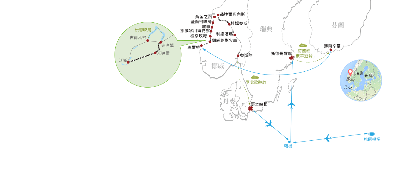 →中間安排一段飛機,直抵峽灣區,輕鬆玩遍北歐四國。