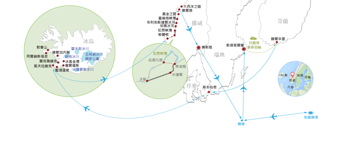 四段中段飛機接駁(①芬蘭-丹麥、②丹麥-冰島、③冰島-挪威、④挪威莫爾德-奧斯陸),創造冰島玩4天3夜、各國大城停留一整天的深度行程。