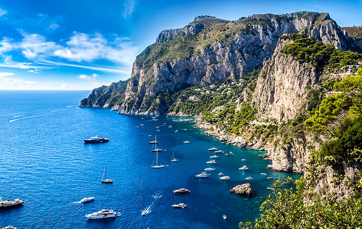 卡布里島以湛藍海水聞名,安排登島並視天候體驗「藍洞」奇景,陽光折射在洞內水面,呈現如寶石般的藍色光澤。