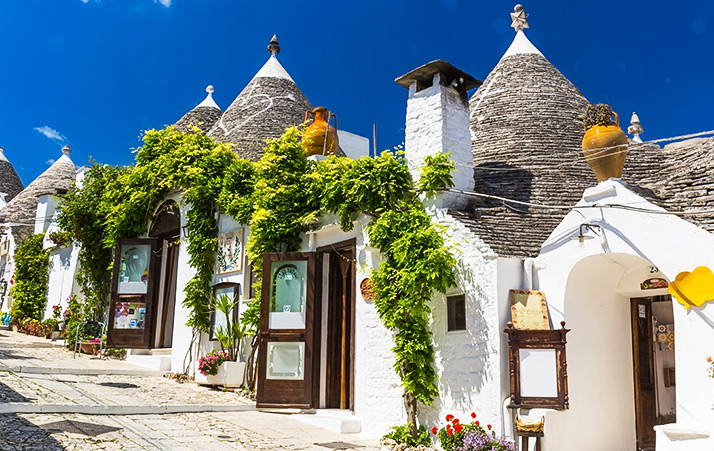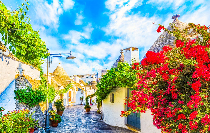 造訪被譽為「石頭之城」的「馬泰拉」,層層堆疊的石窟住宅,訴說數千年的人類居住史;再到「阿貝羅貝洛」蘑菇村,圓錐屋頂與純白巷弄構成童話般的南義風景,是義大利最具代表性的文化符號之一。