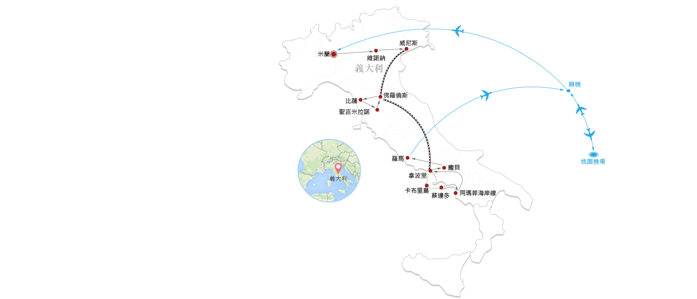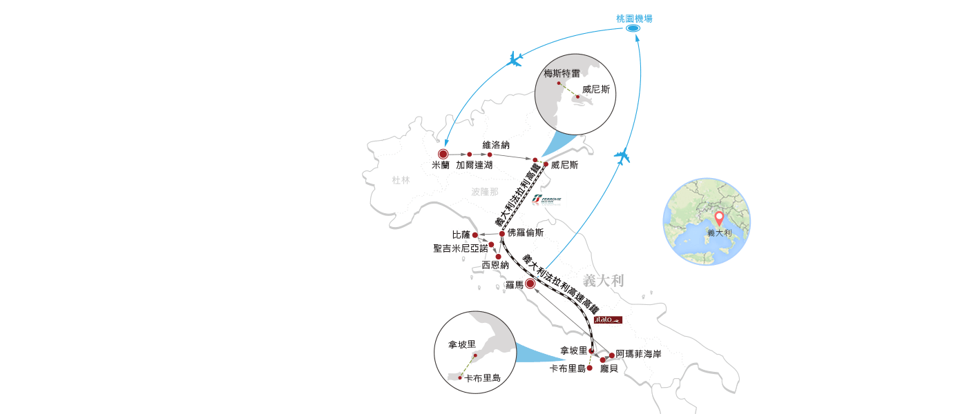 行程採「羅馬進、米蘭出」的雙點進出設計,搭配「義大利高速雙列車」,